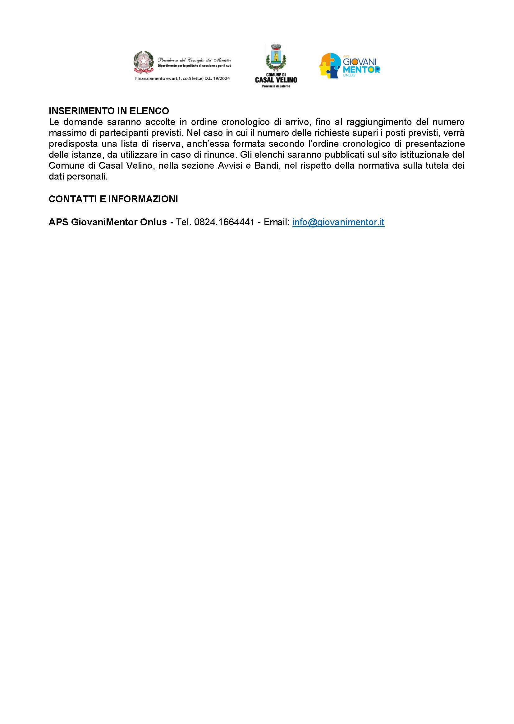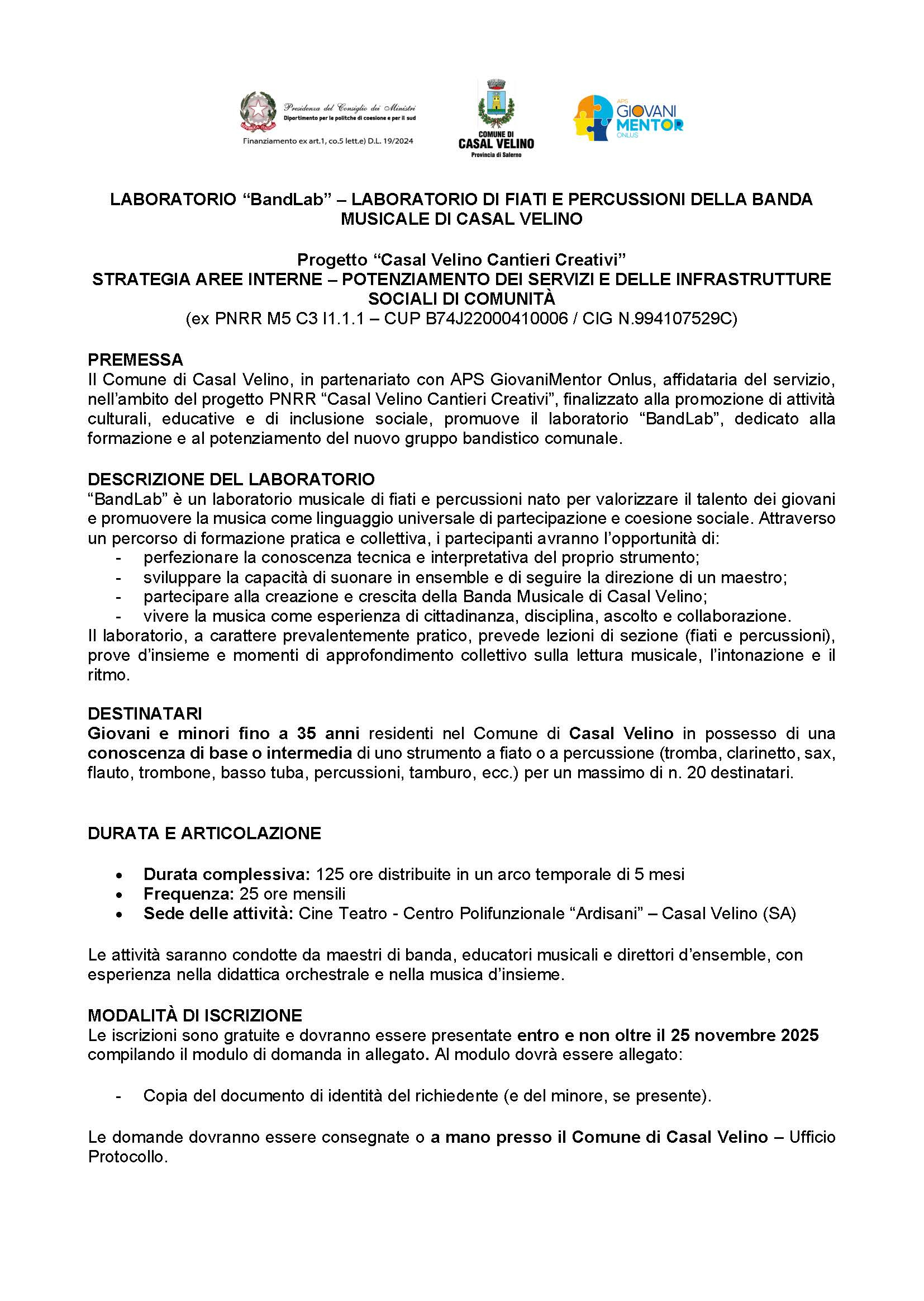 Testo completo title Comune di Casal Velino (SA)Laboratorio “BANDLAB” – laboratorio di fiati e percussioni della banda musicale di Casal Velino (SA). Proroga scadenza richiesta di iscrizione al 31/01/2026