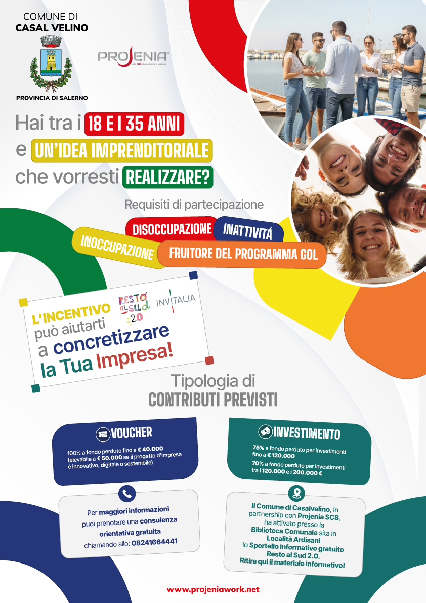 Documenti Comune di Casal Velino (SA) - Resto al SUD - L'incentivo che può aiutarti a concretizzare la tua azienda. Locandina - Io resto al SUD. Caricamento…