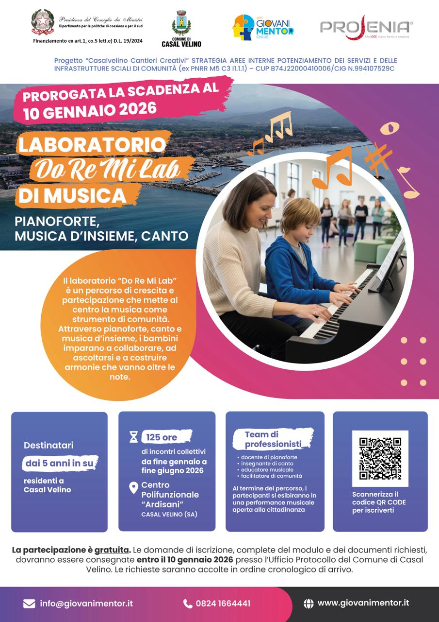 Testo completo title Comune di Casal Velino (SA)Proroga scadenza - Laboratorio "Do Re Mi Lab" di musica – pianoforte, musica d’insieme, canto.